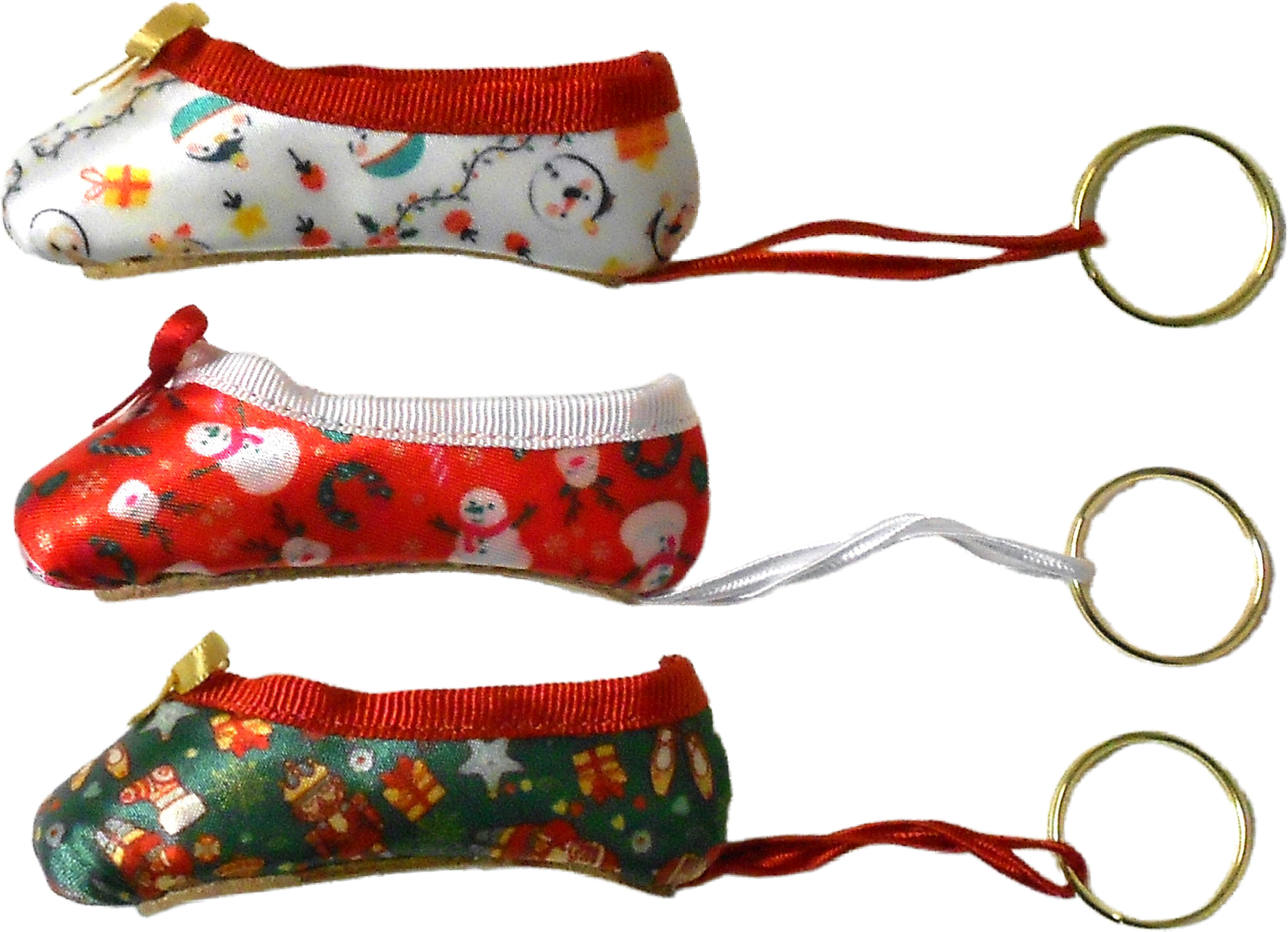 These holiday patterned satin Mini Pointes Shoes can be used as a key ring, zipper pull or even as an ornament for the Ballerina’s Christmas Tree.